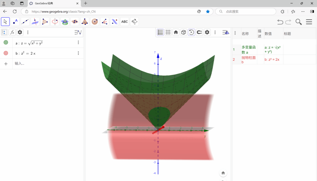 所割下部分的曲面面积。李老师运用数学软件进行了演示,可视化的目的是让学生更加直观的看到立体图形地直观图像,如下图:
